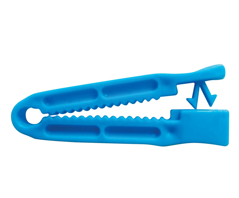 The umbilical clamp securely pinches the umbilical cord immediately after birth to prevent bleeding. It ensures hygienic closure, reducing the risk of infection. Its simple design allows quick and safe application by healthcare professionals.